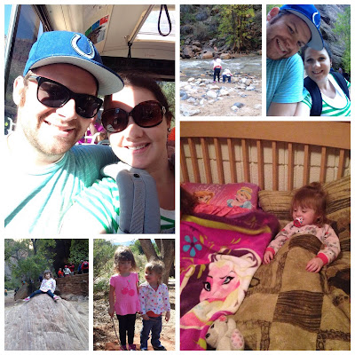 Friday morning we decided to head to Zion National Park; my favorite place! We all drove in our car so my dad could use his perks of being old and get us in for free. We drove through the tunnels, had a fun picnic lunch, and then took the shuttle up to the River Walk for our hike of the day. My girls were troopers on the way up...slow troopers who just wanted to explore, but hey, that is being a kid right?? It took us 45 minutes to walk the mile to the Narrows. Once there, the girls threw rocks in the water for a bit and we headed down. Sam had Madalyn on his back and my dad carried a very gabby Abby on his shoulders who told him all about the water cycle. According to her, the water goes into the mud at night to sleep, and then wakes up in the morning to keep flowing. It only took us about 20-25 minutes to hike down. After that we were all exhausted so we decided to head back to St. George, grabbing some pizza on the way there. That night we watched movies. It was another later night, and we didn't sleep well once again.